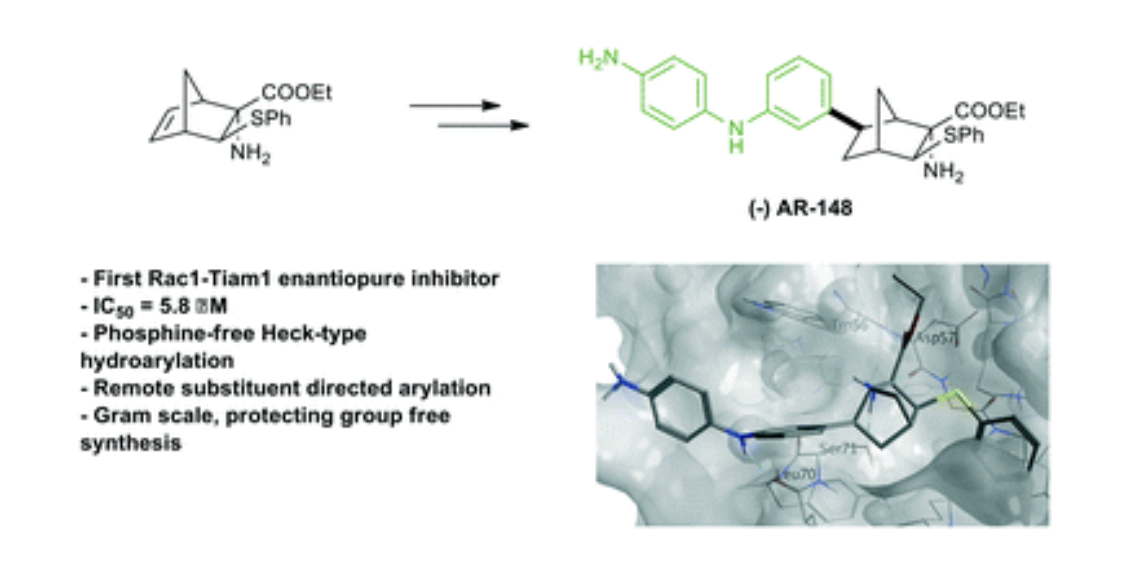 “Identification of the first enantiopure Rac1-Tiam1 protein-protein interaction inhibitor and its synthesis via phosphine free remote group directed hydroarylation.“