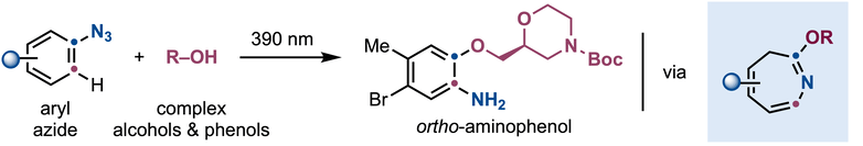 “A photochemical strategy for ortho-aminophenol synthesis via dearomative-rearomative coupling between aryl azides and alcohols.”